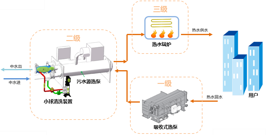 污水源热泵系统+全自动小球清洗装置+多级温升设计